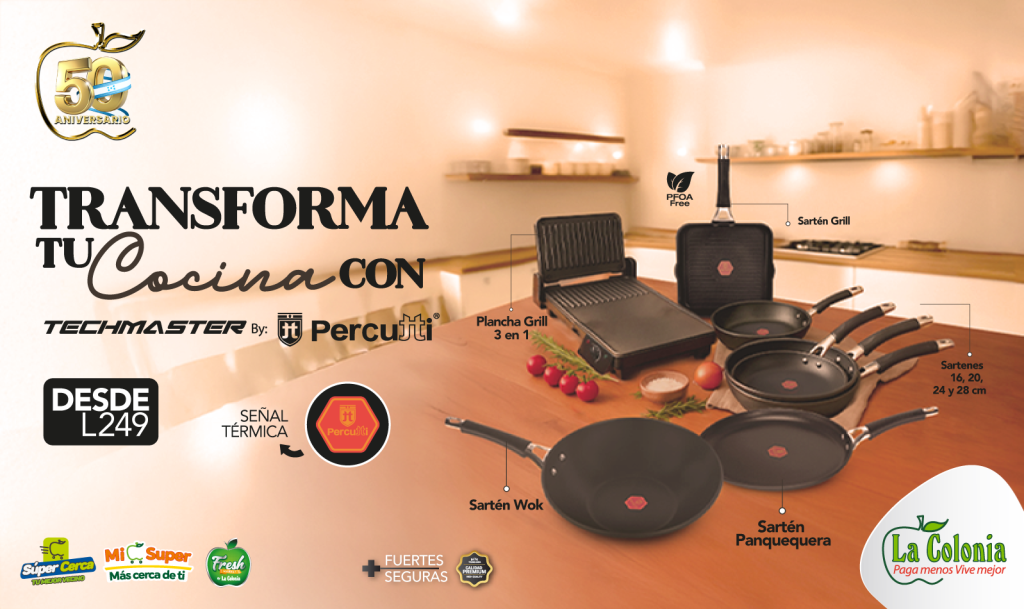 Techmaster by Percutti llega a Supermercados La Colonia con una colección única para transformar tu cocina.En el marco de su 50 aniversario, Supermercados La Colonia presenta su nueva promoción “Transforma…