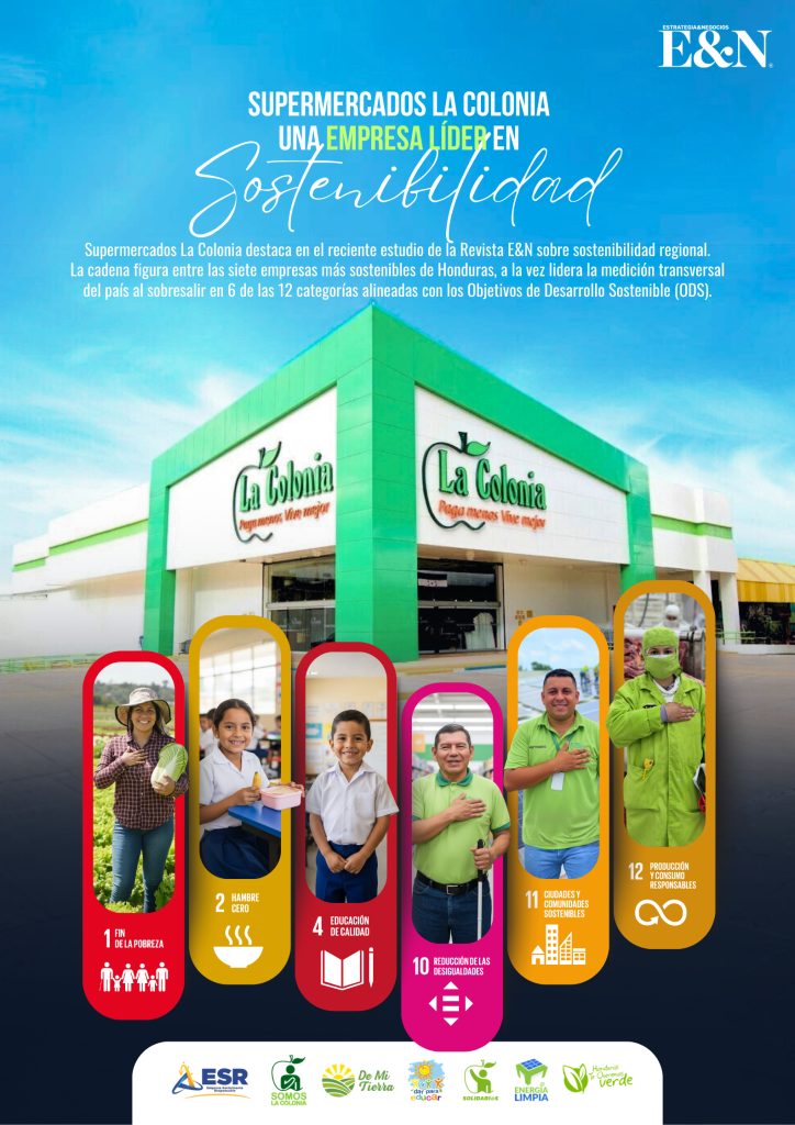 Supermercados La Colonia reafirma su liderazgo en sostenibilidad al ser destacada por la Revista Estrategia & Negocios (E&N) como una de las empresas con mayor compromiso social, económico y ambiental en Honduras y la región. El reciente estudio publicado por el medio analiza, de forma diferenciada, el desempeño sostenible de empresas y marcas centroamericanas, posicionando a La Colonia como referente nacional.